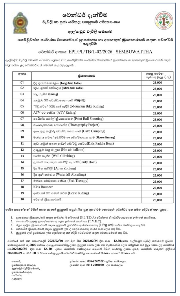 NewsCategory: NewsPost navigationPreviousPrevious post:Tender NoticeRelated PostsTender NoticeJanuary 16, 2026කොන්ත්රාත්කරුවන් සහ සේවකයන් බඳවා ගැනිම.August 30, 2025Tender NoticeAugust 14, 2025Tender NoticeJuly 23, 2025Tender NoticeJuly 9, 2025Welcoming 2025January 22, 2025